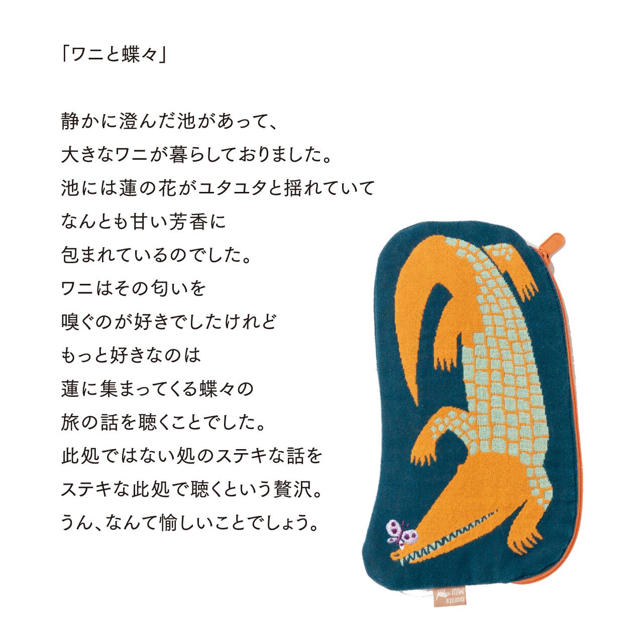 ゆっくりとした世界に暮らす生き物たちのカワイイ形のポーチです。ちょっと不思議であたたかな絵とカラーリングが、絶妙なバランスです。一つ一つの柄にストーリーがあり、その世界観も楽しめます。表柄、裏生地とファスナーのMiWカラー・ハーモニーが新鮮です。