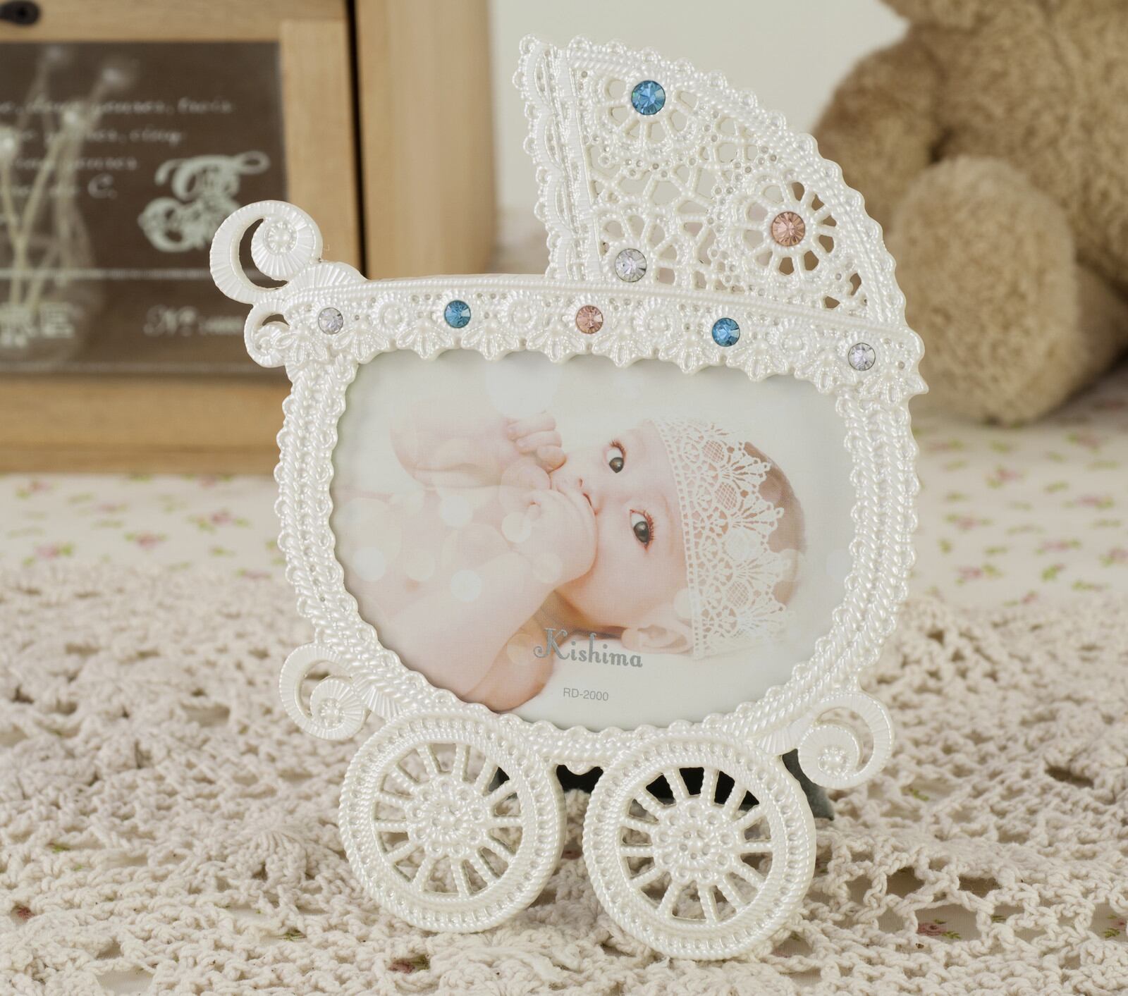 素敵なデザインの上品な乳母車のフォトフレームです。様々な色のクリスタルラインストーンがちりばめられていてキラキラ可愛いです。