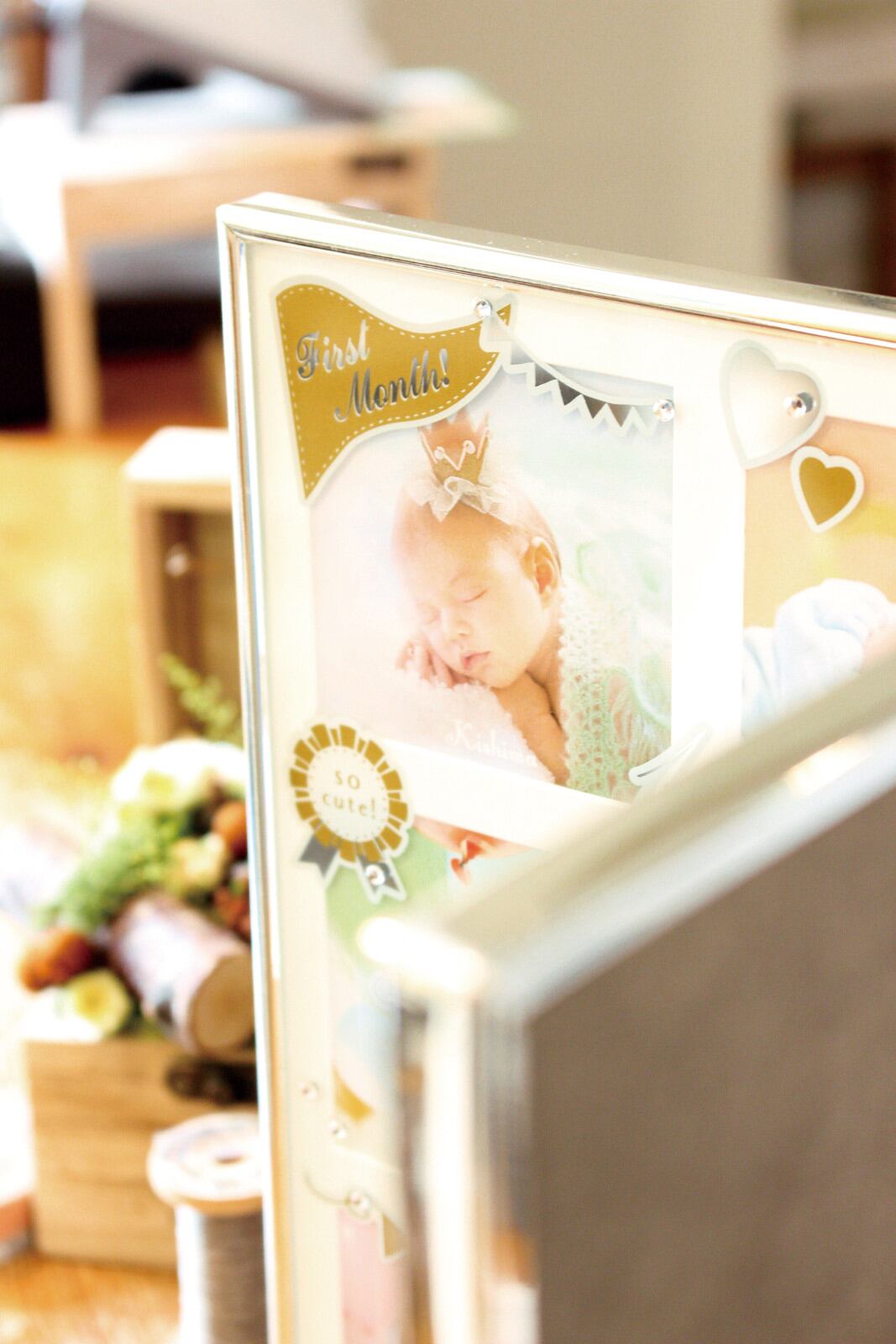 【2層に重なるガラスの間に写真を挟み込んで飾るベビーフォトフレーム】