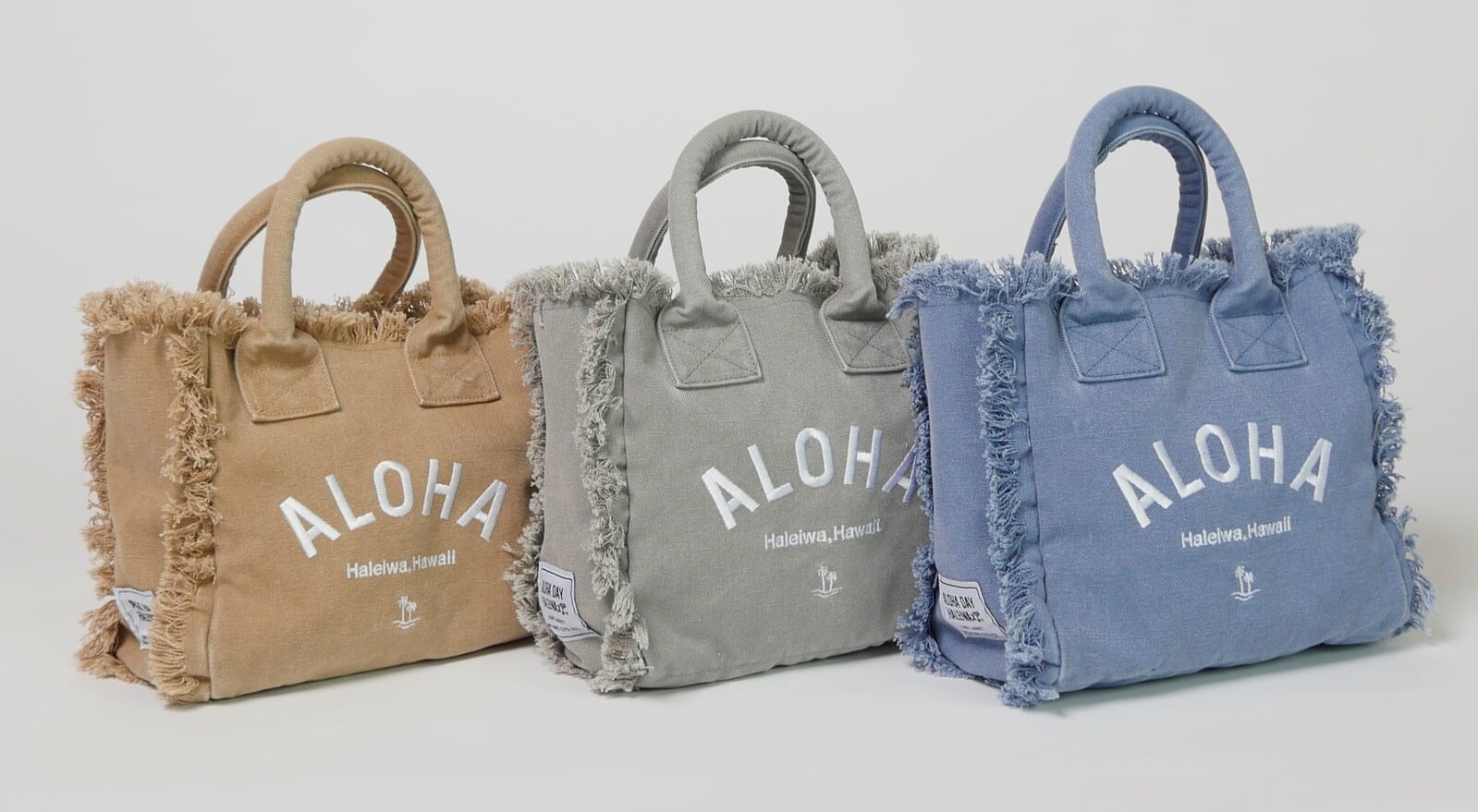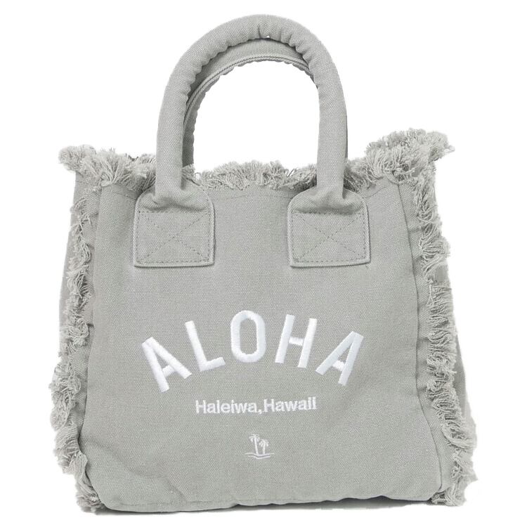 ショッピングカートを押して走る女の子がトレードマークのハレイワハッピーマーケットのミニトートバッグ。ALOHA、Haleiwa Hawaii、ヤシの木の刺繍とフリンジがアクセントになっています。綿100%の素材なのでオールシーズン使えます。